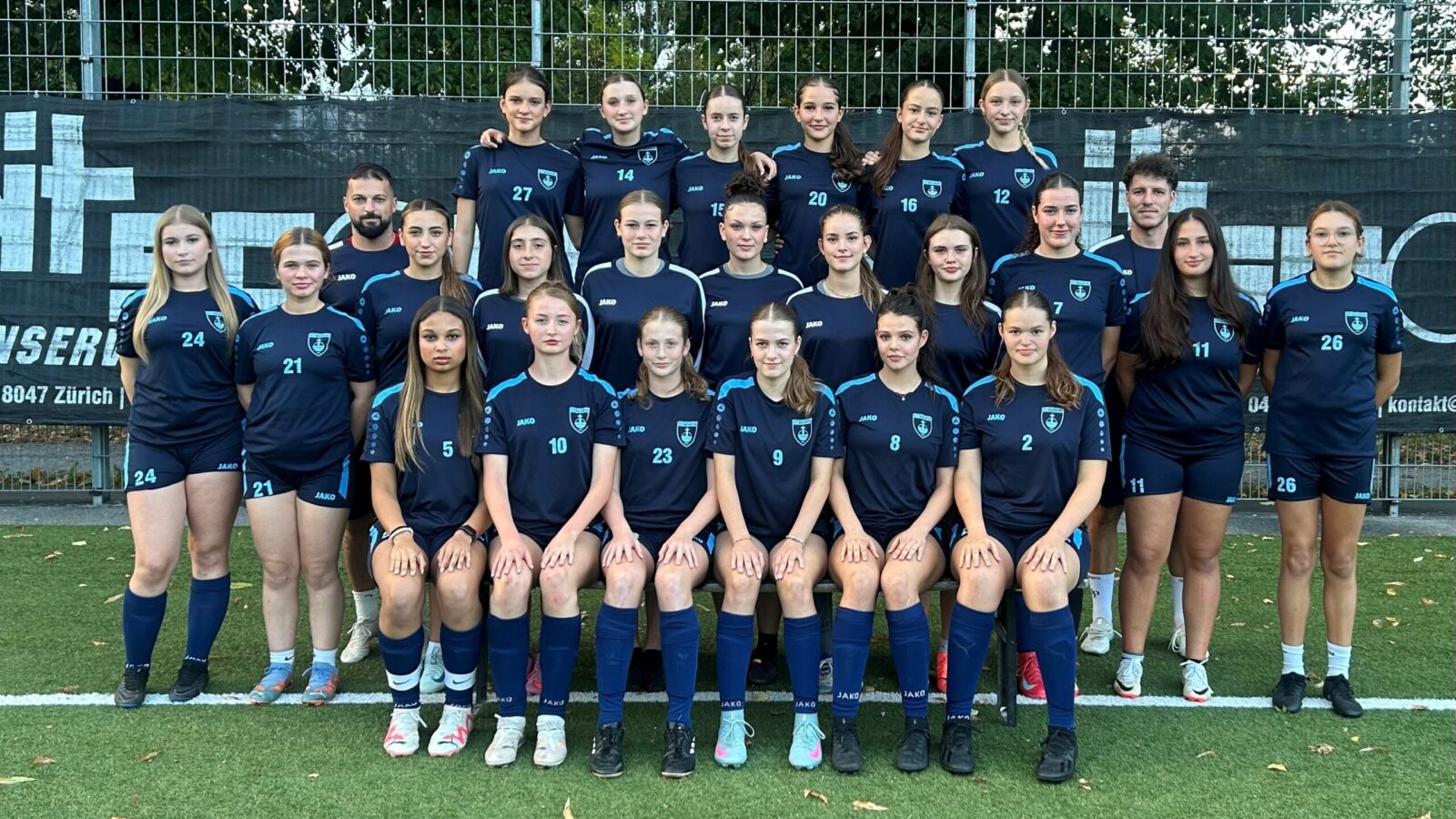 Hintere Reihe (von links): Joel Jenni (Coach), Emily Denholm, Hannah Fuchs, Fabienne Meier, Malia Hamburger, June Bischofberger, Edda Claude, Fabio De Tommasi (Coach); mittlere Reihe (von links): Emely Hallgren, Schirin Reich, Sophia Hollenstein, Julia Beldi, Lena Büchi, Juna Röllin, Lea Hering, Clara Petrausch, Marielou Hartmann, Lia Ferreira, Noelle Schwarz; vordere Reihe (von links): Sara Jabbie, Jelina Reuteler, Elena Sigrist, Janina Bühler, Lea Schefer, Eva Kowarik. Auf dem Bild fehlen: Dounia Arahal, Lily Burkitt, Malea Estermann.